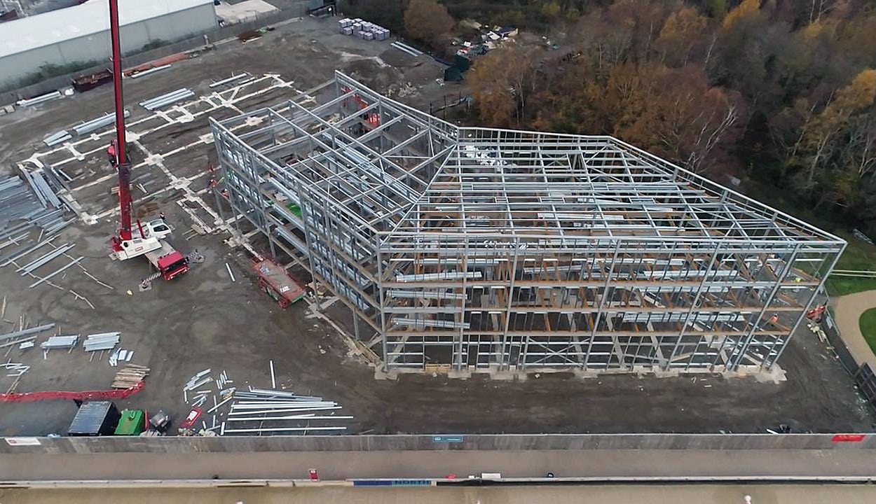 Working on a design and build contract, the steel frame was designed by BD Structures and consists of composite downstand floor beams that support metal decked flooring for the structure’s upper levels. Along with the steelwork, precast staircases were also installed, by BD Structures, who completed the work using a solitary 80t-capacity mobile crane.