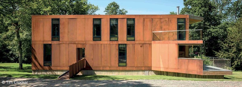 A weathering steel plate bridge, that leads to the front door, is set into a steel clad elevation whose oxidised surface echoes the autumnal hue of the trees around.
