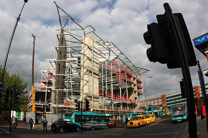 Another eye-catching part of the job is the structure’s main entrance area which features a full height atrium. Completion of the work along this elevation called for six overnight road closures while the high level steelwork, which is 26m above pavement level, was lifted and fitted into position.