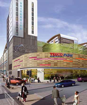 A new town square will be at the heart of the complex, which will also include a nine-screen cinema, cafés, bars and restaurants. Student accommodation for around 1,000 students across eight, high-rise blocks will be built on top of the Tesco store. Elsewhere on the site, 1,860 sq m of offices will be built using a steel-framed structure which has a column arrangement suitable for converting it to a 120-bed hotel.