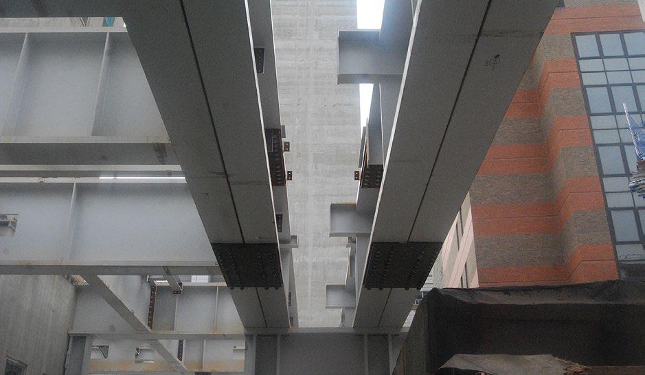To create the column-free space over the remains, two parallel 17.5m-long girders have been installed at first floor level. As they are positioned in the middle of the transfer structure at the furthest point from any vehicular access point, there was a need to redesign these members in order to limit the size of crane needed to lift them into place. The girders are consequently formed from channels, which were spliced together in-situ, to form a 25t section. There are eight 1,850mm-deep pieces in total; four needed to complete each girder.