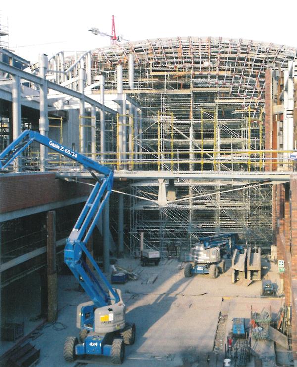 The expertise of the steelwork contractor determined the most practical way to fabricate and erect the structure to the necessary tight tolerances. The engineering design required the connections to be welded. The atrium roof was fabricated by cutting the tubular steel with square ends and then welding to precision machined solid nodes. The roofs were divided into transportable 'ladder' frames that were two bays wide and approximately nine bays in length. The fabrication of the toroidal geometry was closely controlled through precise jigs constructed off-site by the steelwork contractor. The tolerance of the fabrication and construction of a frame of this form was essential to the success and quality of the roof.