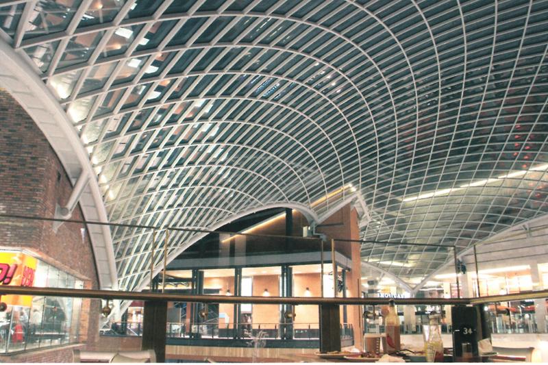 The mixed styles of this retail development are unified by a series of spectacular glazed roofs in various shell and vaulted forms. The structural design is an intelligent re-engineering of the initial concept. By rationalising the geometry and detailing for maximum repetition the fabrication, erection and glazing were all simplified.