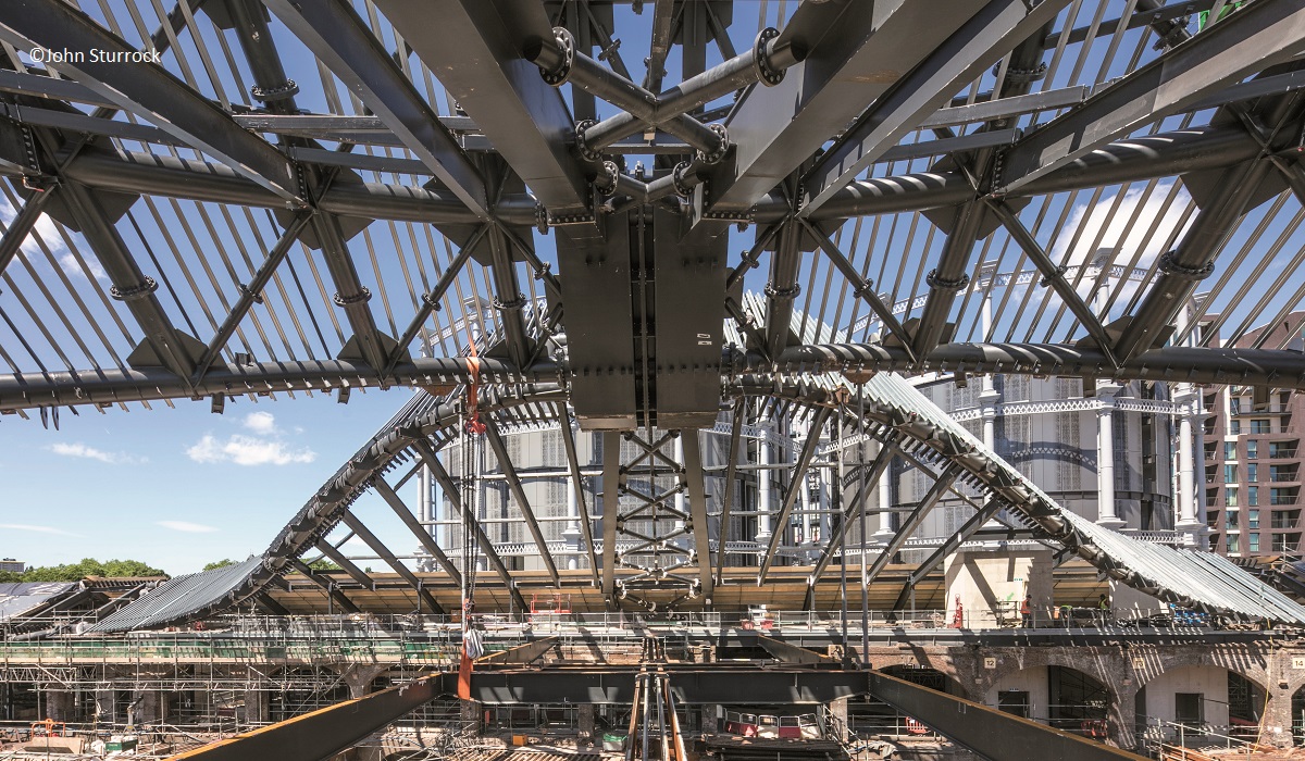 The steel structure consists of three ‘bows’ (or tied arches) that rest upon one other. The central bow spans the shortest distance between buildings and hides a steel V-shaped member within the small cladding envelope that is available at the kissing point. Hidden below the floating floor a tie carries a 20MN tension to resolve this bow. The ribbon-shaped roofs are formed by the 2ndand 3rd bows. These consist of a ribbon-shaped truss complete with three chords and bracing and are supported at the northern and southern end of the Coal Drop buildings and centrally on the first bow. Their horizontal forces are resolved with a tie hidden at floor level on the inner edge of each building.