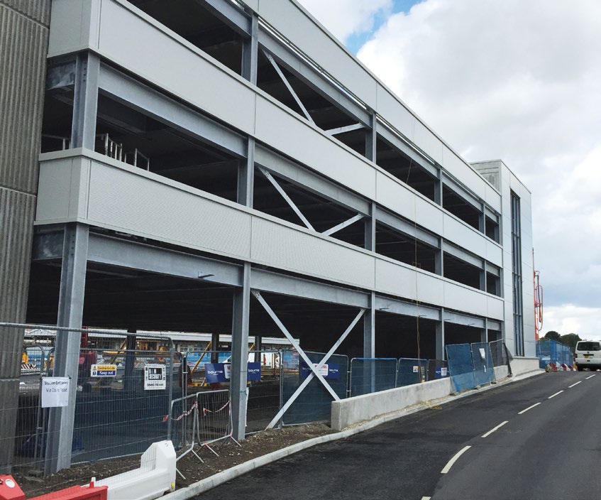 “Logistics was the biggest challenge on this project as we had to work adjacent to an existing car park and busy railway lines,” says Bourne Parking Project Manager Kevin Clarke. “We had to ensure our cranes didn’t overslew the adjacent car park and railway and we had to erect the steel frame in a sequence which ensured, in the event of an accident, it couldn’t fall on to the rail tracks. This was done by erecting the sections of the car park furthest from the rail lines first, and once we had a stable structure the last bays along the Network Rail boundary were bolted onto this braced frame.”