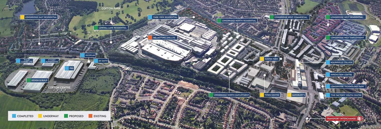 The overall Longbridge regeneration project is vast and covers an area of 450 acres in south Birmingham. Formerly a large car manufacturing plant employing as many as 250,000, with a history incorporating many innovations in car production, the site was acquired by St. Modwen in 2003 from MG Rover. The car manufacturer then leased back a portion of the site, freeing up the rest of the land to be redeveloped. MG now has Chinese owners and retains a small research and development presence at Longbridge, but all around is changing fast.