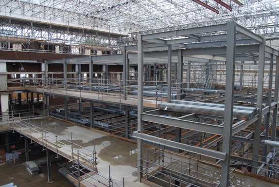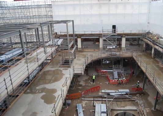 ISG Project Manager Adam Wright explains the early part of the construction programme: “Basically it was a large cut and carve operation to the existing reinforced concrete frame. “We have retained the façades and wings of the centre while demolishing internal parts of the scheme around the open central square, and enlarged one area with three new steel-framed floorplates. We have also removed the existing roof and glazed atrium and taken out most of the staircases.”
