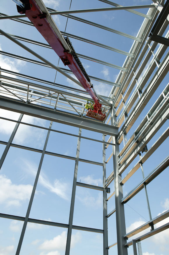 To this end the MTC building features three large open plan halls positioned side by side. The two outer halls have spans of 27.5m, 22.5m, while the central hall is a double span frame with a 41m span. These large portal frames will house the production areas and the steelwork for each hall also has to support a large overhead crane. Crane beams, running along the top elevation of each hall, have plates welded to the top flange to assist buckling resistance.