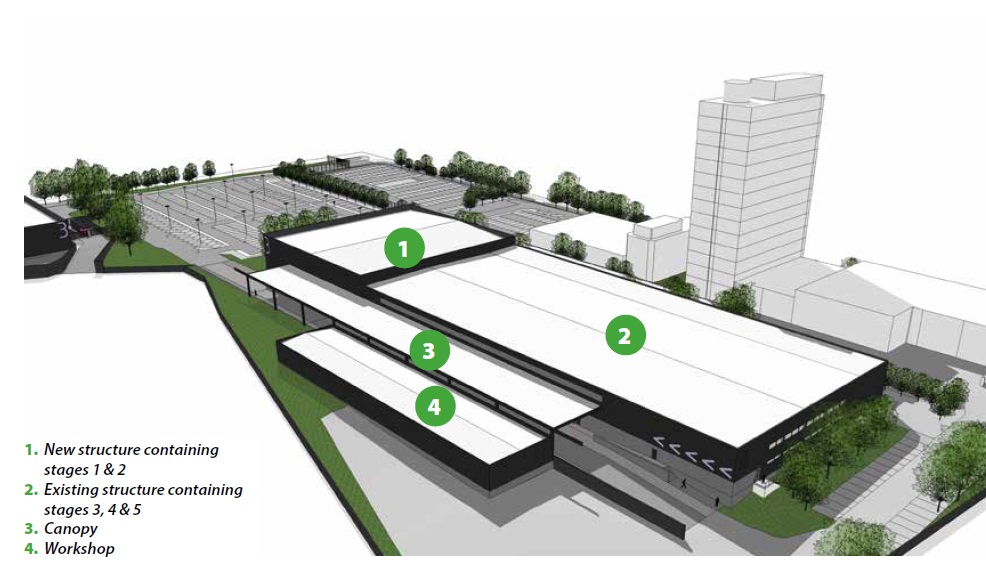 Three of the stages (3, 4 and 5) are being built inside an existing steel structure, formerly used by Fujitsu Computers, while a steel framed extension to this building will house two more stages (1 and 2). Notable features of the new facility include a dedicated two-storey support space adjacent to stages 3, 4 and 5 that will accommodate dressing rooms, showers, a laundry and production offices.