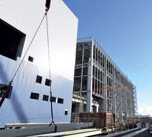 As the columns were too large to transport they were delivered to site as 24 tonne and 9 tonne pieces. The full column was then assembled on the ground before being erected as a single piece. Similarly, the roof trusses were delivered as three equal sections, with two parts bolted together on site before being joined with the third section in the air as part of a tandem lift involving two mobile cranes.