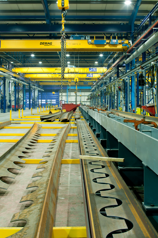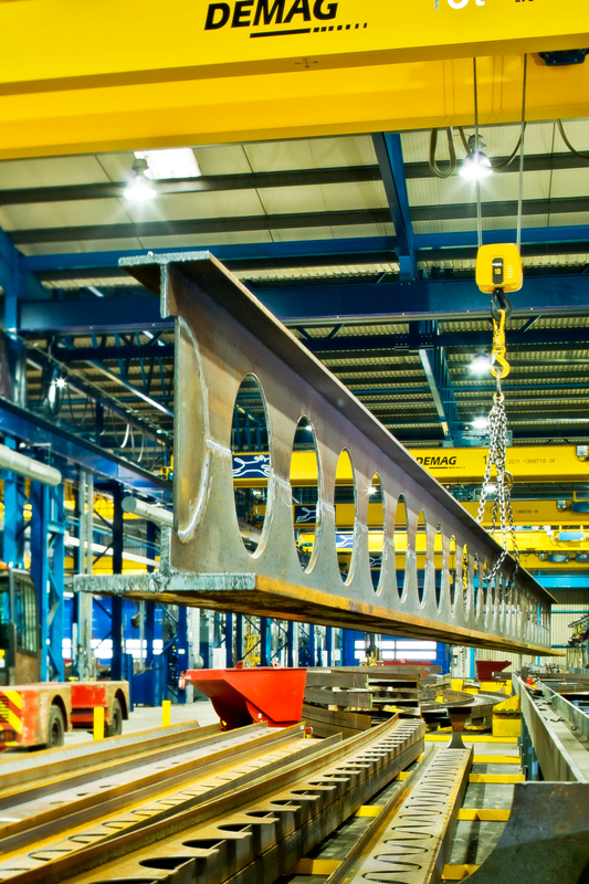 Castellated or cellular beams are examples of longer span members which have large, generally regular, openings within the web depth. These beams achieve the benefits of greater structural efficiency by increasing the section depth for a given use of steel, and provide multiple routes for services. Cellular beams have greater architectural appeal because of their apparent lightness and distinctive appearance in long-span roofs and floors.In a castellated beam, the web of a rolled section is cut along the length of the beam in a hexagonal ‘wave’ form. The two pieces are separated, offset and then welded together to achieve a deeper section.