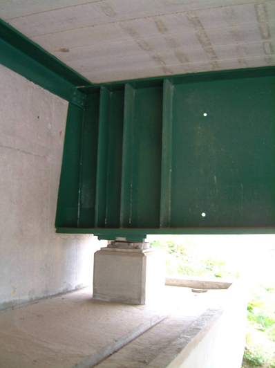 Since conventional bearings are used, provision for bearing replacement must be considered. It is relatively straightforward to add stiffeners at jacking positions on the girders and to make space on the bearing shelf for jacks but the consequence on the retaining wall and pavement must also be considered. Vertical movement of about 5mm is needed to remove mechanical bearings and about 10mm for elastomeric bearings. A flexible layer between end screen wall and backfill should be provided to accommodate this movement and it must be recognised that the asphaltic plug joint will need to be renewed at the time the bearings are replaced. Nevertheless, the need to replace the bearings, with the consequent damage to the plug joint means that this is now a less favoured solution and may not be acceptable to some client authorities.
