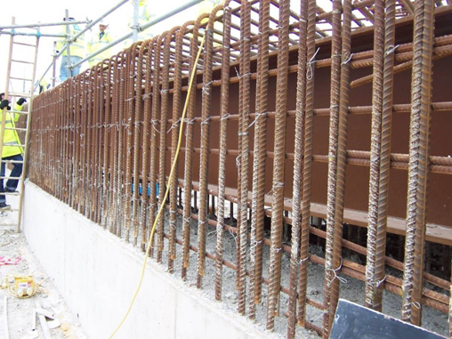The upper capping beam is usually quite heavily reinforced. Where there are tie beams between the main girders, care must be taken in detailing, to avoid congestion and to avoid creating difficult fixing details (for example, ties inside a cage of hooped bars). An alternative that avoids this conflict is to use bracing just in front of the end screen wall; if this is left in place it will need to be painted, otherwise removal is an additional site activity.