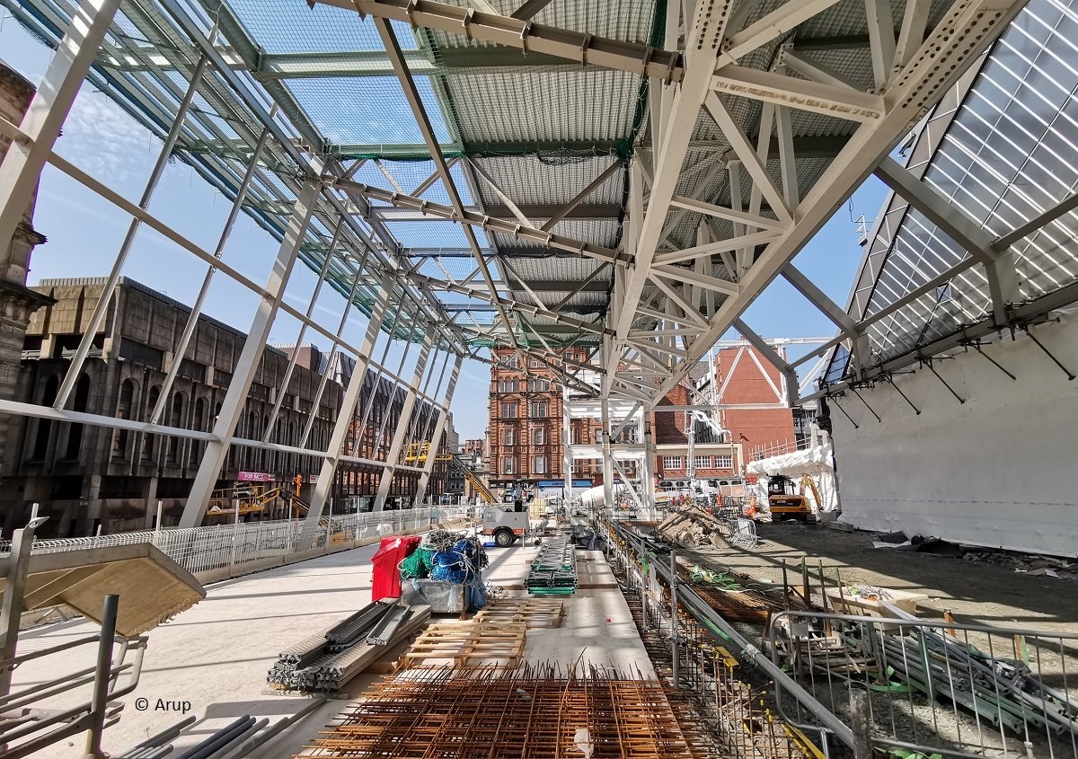 The storey-high truss was lifted in sections overnight during station close, with daytime commuters protected from the elements and overhead works by passenger tunnels.