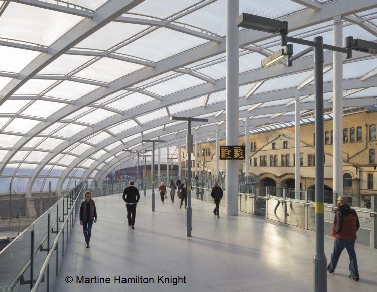 The tubular steel ribs forming the new roof create an effective transition between the curving railway tracks and the adjacent buildings. Despite severe constraints the steelwork was erected on schedule with the station remaining operational throughout. The result is a completely transformed space, with the exposed steelwork a dominant feature.