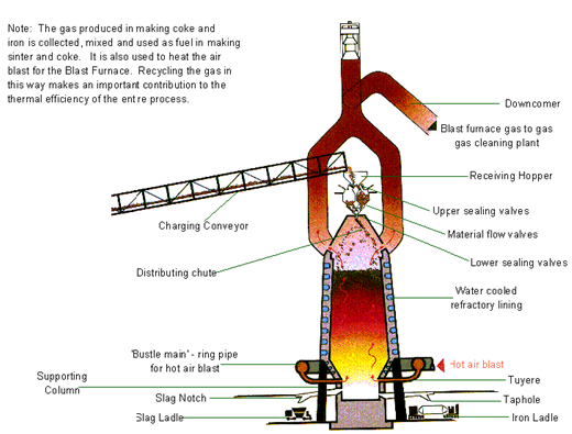 Coke, ore and sinter are fed, or ‘charged’, into the top of the blast furnace, together with limestone. A hot air blast, from which the furnace gets its name, is injected through nozzles, called ‘tuyeres’, in the base of the furnace. The blast air may be oxygen-enriched and coal or oil is sometimes also injected to provide additional heat and reduce coke requirements. The blast fans the heat in the furnace to white-hot intensity, and the iron in the ore and sinter is melted out to form a pool of molten metal in the bottom, or hearth, of the furnace. The limestone combines with impurities and molten rock from the iron ore and sinter, forming a liquid ‘slag' which, being lighter than the metal, floats on top of it.