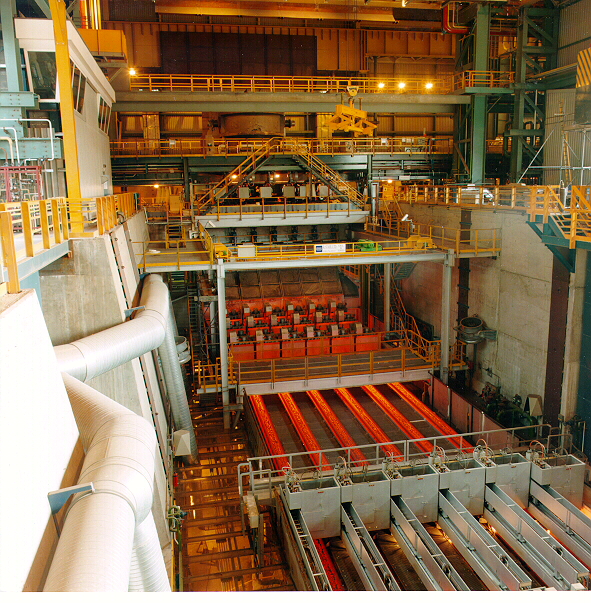 Before molten steel can be rolled or formed into finished products, it has to solidify and be formed into standard, semi-finished casting products which are available in basic shapes called billets, blooms or slabs. Until the development of the continuous casting process, these shapes were always produced by ‘teeming’ (pouring) the molten steel into ingot moulds. The ingots are placed in soaking pits (ingot re-heating furnaces) to bring them up to a uniform temperature before being passed to the primary mills, which then begin to roll them into the required shapes. However, most modern steels are now continuously cast.