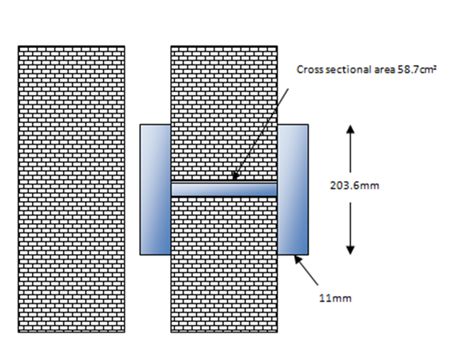 Where sections are partially exposed, the section factor is calculated based on the full cross-sectional area but the exposed perimeter only. One of the most common situations where this occurs is with columns in perimeter walls. For the example shown, which is a 203 x 203 UC 46: