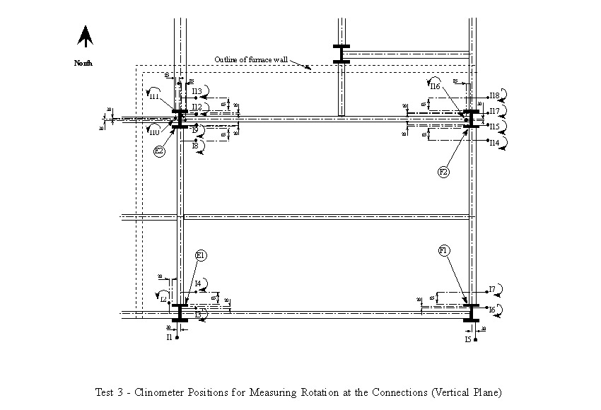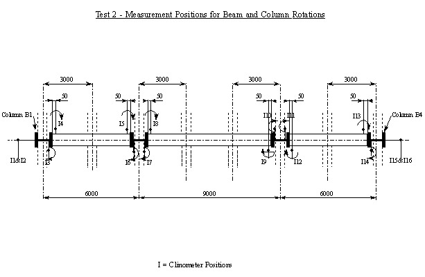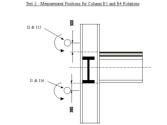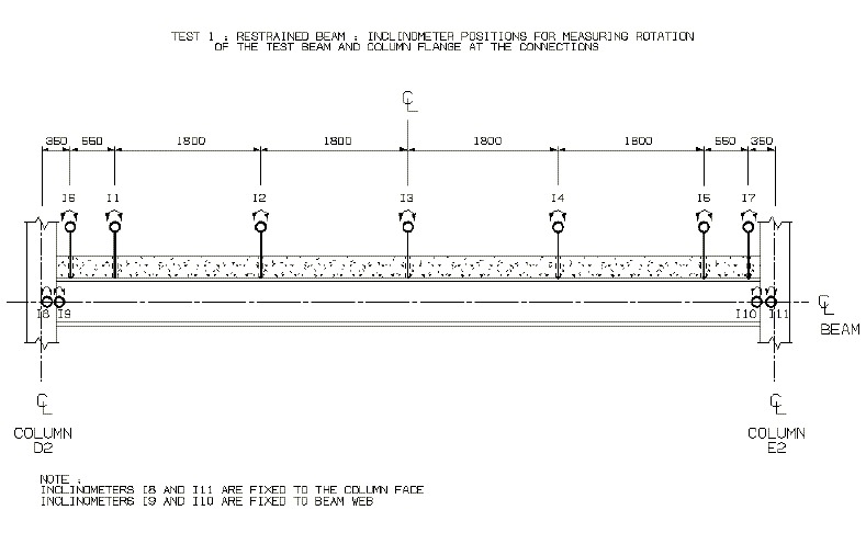 - Inclinometer positions for measuring rotation of the test beam and column flange at the