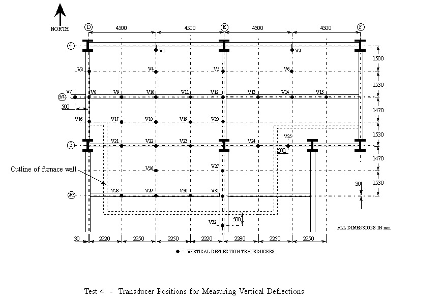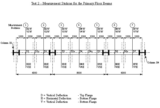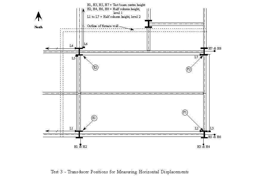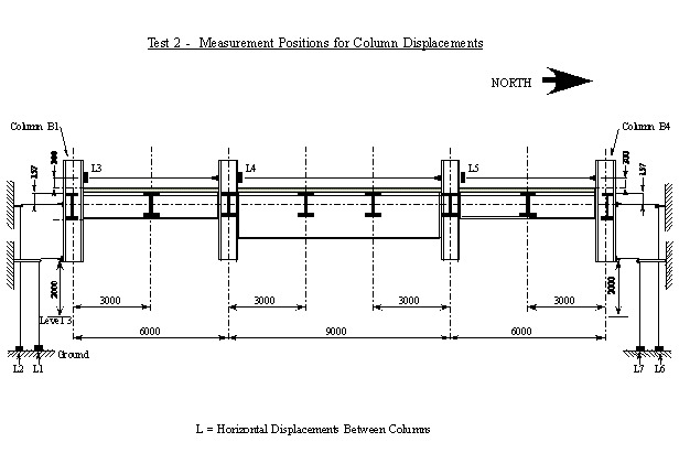 - Location of instrumentation for measuring horizontal displacement between columns above the test floor