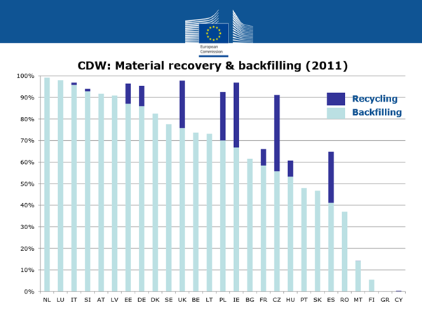 The figure (below) shows the recovery rate for C&D waste in EU member states in 2011. As shown, most Member states are already (even in 2011, which is the latest EU data available) exceeding this 70% target. More challenging targets are therefore required to encourage moving up the waste hierarchy and doing better than simply crushing and downcycling the majority of EU C&D waste.